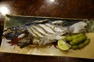 トマトをいただいて、さっぱりした後にめばるの塩焼きをいただきました〜!めばるは煮つけが基本だと思っていたのですが、塩焼きがほんとおいしいんですよ〜!これはほんとだまされたと思ってたべてみてください!パーク君もおいしいって言っています!