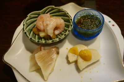 まずは生ビールで乾杯しまして、いつもの先付けをいただきます!私は海老があんまり好きではないのですが、えび一さんの海老は好きなんですよね〜。この日も先付けからとってもおいしくいただきました〜!