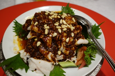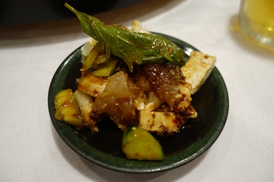 まずはビールで乾杯させていただいて、最初のお料理は豚肉とお豆腐ときゅうりのピリ辛ソースでした。名前は聞いたのですが、忘れてしまって、、、。とにかくおいしい〜!キュウリのみずみずしさとピリ辛のソースが合いますね〜!