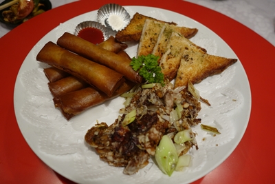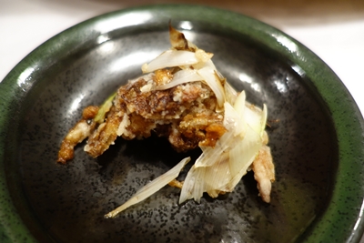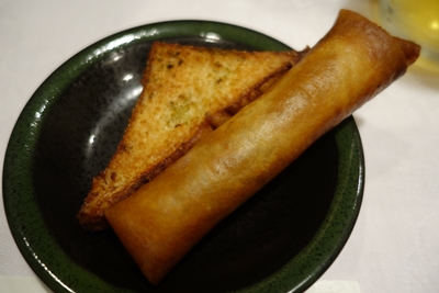 つづいて春巻き、すり身をパンではさんで揚げたもの、ソフトシェルクラブ(だったかな)が登場しました!な〜んだ春巻きかと思ったらいけませんよ!この春巻きがもうとってもおいしんですから〜!クラブは切り分けていただいてまるごといただきました!もう食感がたまりませんね〜!