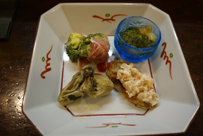 まずは先付けから〜!体にとってもいいブロッコリーが!私ブロッコリー大好きなんです!生ハムといい相性ですね〜!牡蠣もおいしい〜!