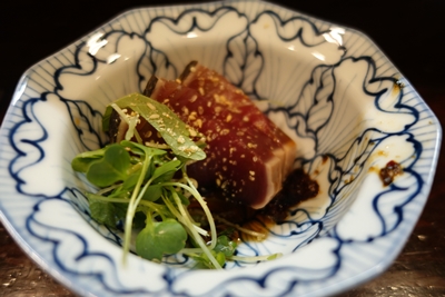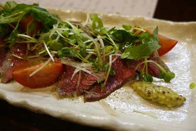 ここでお肉が食べたくなって、、、タタキをいただきます!もうこれが最高においしい〜!やわらかくって肉の味が濃い!うまいです〜!