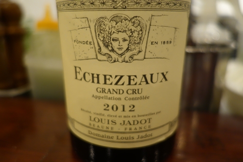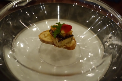 最初はフォアグラのブリュレが登場しました〜!とってもおいしそう〜!うわ〜〜!こういう風味なんですね〜!甘みとフォアグラの風味がマッチしています!ワインはルイジャドのエシェゾーをいただきました〜!