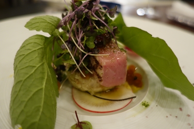 続いては中トロのミキュイをいただきます!中トロのトロ具合がすご〜い!いただくと、、とろける〜!下の野菜と一緒にいただくとさらにおいしいです〜!広島にもこんなすばらしいフレンチいただけるお店あるんですよ!