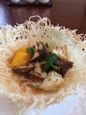 つづいてヒレ肉と野菜の炒め物が登場しましたよ〜!この器のようになっているものを食べてもいいものか、、、どうか、、、ちょっと悩んでしまいましたが本当は食べれたんだと思います。