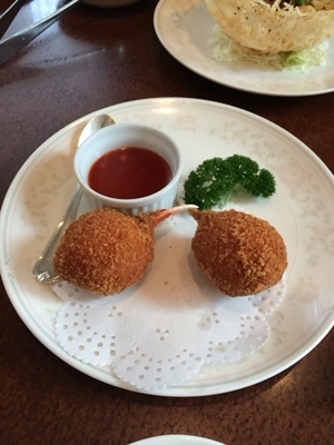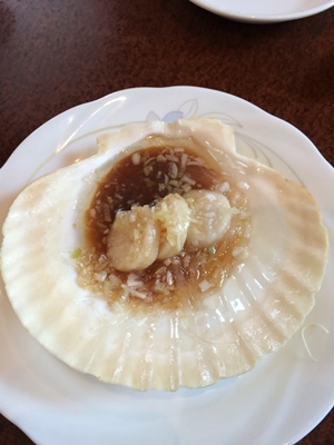 蟹のツメの揚げ物が登場しました〜!中には蟹肉がびっしりつまっていましたよ〜!つづいてホタテのソテーが登場しました〜!おいしいソースでした!