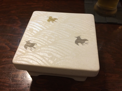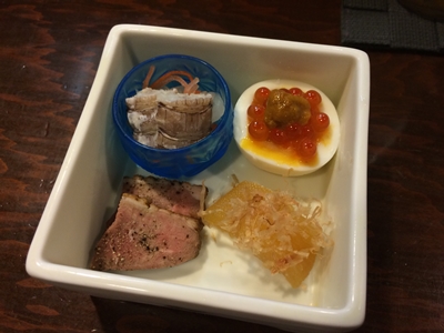 まずはとってもおいしい生ビールをいただきながら、先付けをいただきます!お正月はこちらの器が登場します!おめでたい器ですよ〜!おいしい〜〜〜〜!