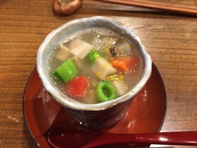 まずは生ビールをいただいてから、先付けが登場しました〜!ちょっと名前は忘れちゃいましたが、野菜がたっぷりはいってとってもおいしかったです。冷えていた体が一気にあたたまりました〜!