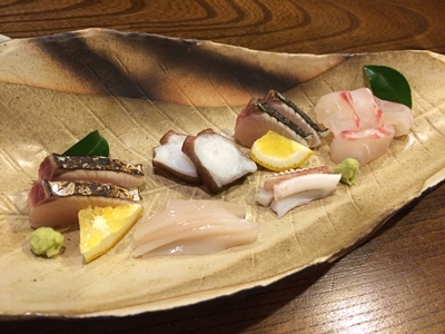 ここでお刺身の盛り合わせをいただきました〜!タコ、水イカ、サワラ、タイ!どれもとってもおいしい〜!さすが大将の目利きにかなったお魚たちですね!