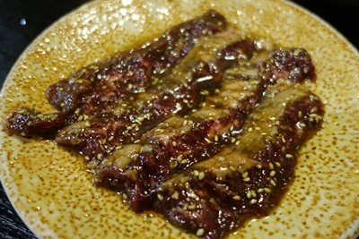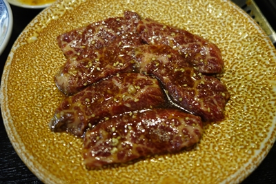 つづいて、ロース、カルビ、ハラミをお願いしました〜!ニュー明月さんのこの漬けダレがなんともいえずおいしんですよね〜!このまま生肉のままほおばりたいくらいなんですよ〜!表面が焼けたかな〜というくらいのレアでまずいただくと、、、うまい〜〜〜!お肉もうまいし、タレもおいしい〜!もう最高ですね〜!