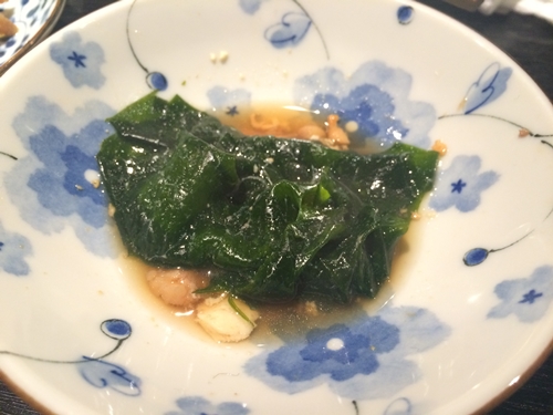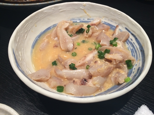 まずは生ビールで乾杯しまして、おつまみとしてアンコウの胃袋からいただきました!説明がなかったら全くなんなのかわからなかったですね〜。と〜ってもおいしい!こりこりした食感とゼラチン質がたまりませんね〜!