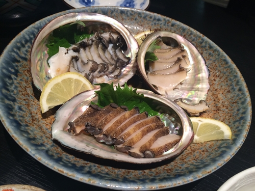 アンコウと一緒にアワビも送っていただいたそうで、立派なアワビのお刺身が登場しました!もう最高〜!鮮度もいいのでとってもおいしいですね〜!少しは残してあとでアンコウ鍋でしゃぶしゃぶさせていただきました!