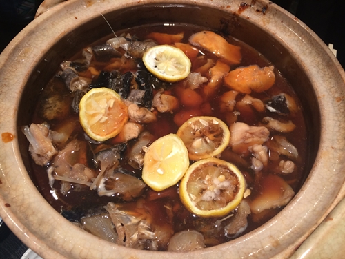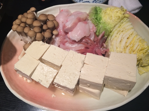 ここでついにアンコウ鍋が登場しました〜!いい香りがしますね〜!身と肝と豆腐と一緒にいただきます〜!とってもおいしい〜〜〜!いい出汁でていますね〜!肝もおいしい〜〜〜!濃厚ですよ〜!身もぷりっぷりしています。聞くとヒレの部分もしゃぶしゃぶしていただくとゼラチンのような感じにおいしくいただけるんですって〜!