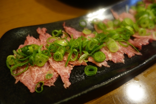 続いて登場したのが、ツラミ!牛さんのほっぺたっすね〜!ねぎをしっかりまいていただきます〜!う、う、う、うまい〜!ゴマ油につけていただきましたが、本当においしい〜!さすがはかんてきさんですね〜!たまりません!