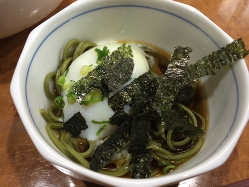 この日のお通しは茶そばでした〜!ちゃんと温泉卵も入っていますよ〜!こういうところがうれしいですよね〜!おいしいです〜!