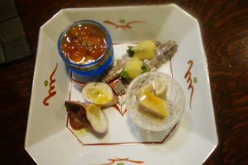 いつもどおりまずは生ビールで大将と乾杯いたしまして、超楽しみな先付けをいただきます。しゃこにいくらに子持ちのイカに肝!どれもおいしいですね〜!最近なんだかシャコが大好きになってきました、、、、がっつきそうになるところを我慢してゆっくり味わっていただきます!