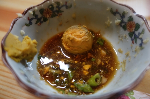 そうなんです!黄身はあとでホルモンおでんと一緒にいただくので、白身だけなんです!しょうががきいているのですがこれが本当においしい〜!すりたてのしょうがです!