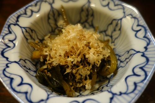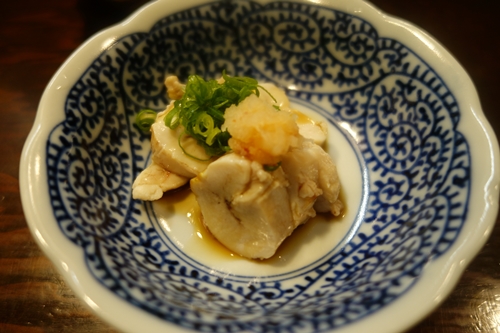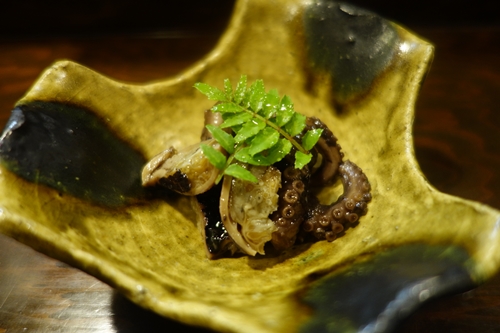 その前に生ビールをいただきながら、いつもの先付けをいただきます!まずはタコからいただきました〜!絶妙なやわらかさがたまりませんね〜!おいしい〜!
