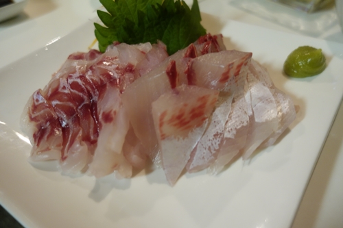 お刺身が登場です!これは先輩が釣ってきたヒラマサとあこう!贅沢な組み合わせですよね!もう最高においしい〜!鮮度が抜群ですよ〜!