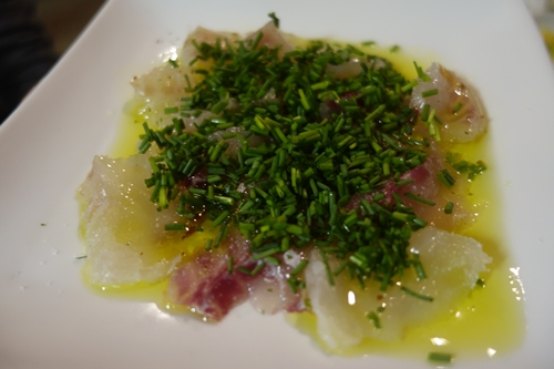 つづいてあこうのカルパッチョが!あこうってカルパッチョにしてもいいんですか?いいんです!もう言葉もないくらいおいしい〜〜〜!