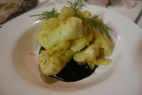 ヒラマサのフリットが!フリットで食べるのは初めてですね〜!しかもイカスミソースですって!いいですね〜!すばらしい!