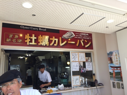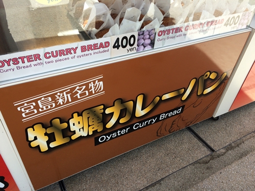 宮島へフェリーで渡って、桟橋から厳島神社にむかって歩いていると、、、あった!ありました!牡蠣カレーパンの文字が!