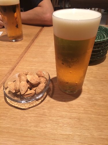 メニューをみてみると、いろんな種類のうどんがあるようですね。まずは生ビールをお願いして、枝豆とあげ玉やっこをお願いしました。生ビールといっしょに殻付きのナッツが登場しました!これがなかなかのおいしさ!