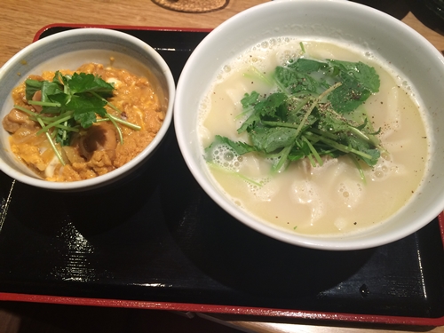 ここで登場しました!とりスープうどんと親子丼!この白濁スープがしっかり煮込んでいますよ〜ってサインをだしていますね〜!