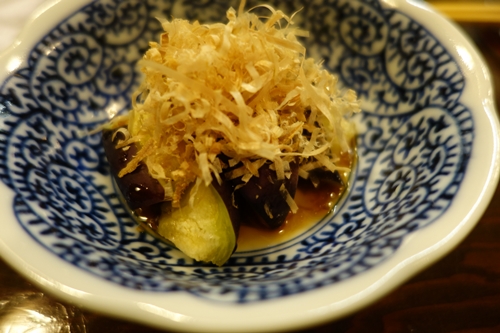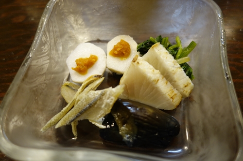 まずは生ビールで乾杯して、先付けをいただきました。サヨリの一夜干しがこれが味がぎゅっと濃縮していてお酒のあてに最高でしたね〜!サトイモだったかな、これがまたとってもおいしい〜!