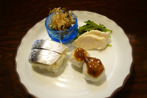さて、いつものように生ビールで乾杯いたしまして先付けをいただきました〜!サバのお鮨もありました〜!まるごと一本食べたいくらいおいしいです!