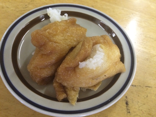 つづいていなり寿司!甘く煮てある油揚げがたまりませんね〜!超おいしい〜!おむすびはなかにおかかのようなものが!これがまた超おいしい!絶妙の甘みがたまりませんね!