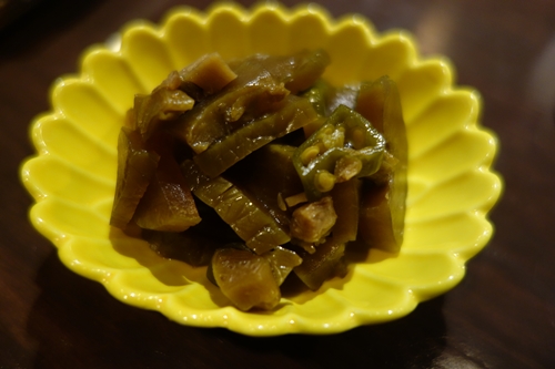 といってお漬物をだしていただきました〜!なんと唐辛子が中にはいっています。これは辛そうだな〜と思いながらいただいてみると、、、おや?おいしい〜!これはおいしい〜〜〜!、、、、からっ!!!後からほどよく辛さが後追いしてきてくれました!珍しい漬物なんだそうですよ〜。