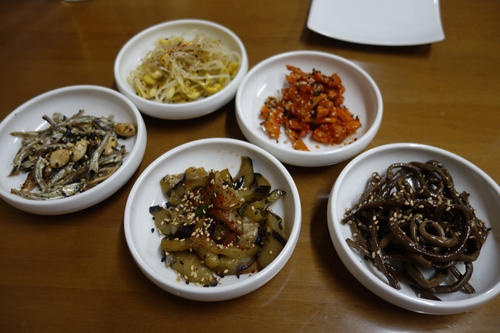 いつものようにお母さんが元気に迎えていただきました〜!まずは生ビールでカンパイです!少しまっているとお母さんの手作りの韓国惣菜が登場しました!