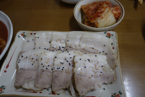 メニューをみながらいろいろとお願いしてみました〜!まずはゆで豚からいただきます!こちらでゆで豚を食べて以降、豚肉は茹でるに限るとこっそり確信しております。それくらいおいしい!キムチにまいていただきます!