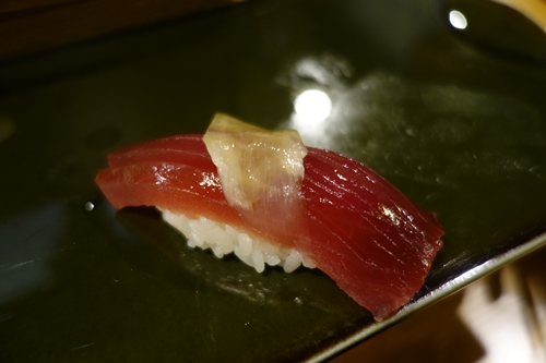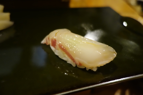 いつもならつまみからいろいろいただくのですが、この日はいきなり握りからお願いしました!まずは鯛から!そのままいただきます!おいしいですね〜!たまりません!