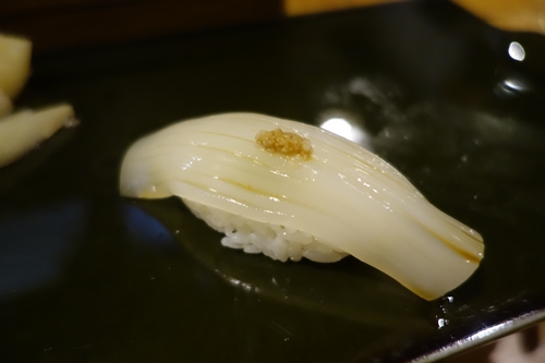ここで大好物のイカが登場しました〜!このイカがまた歯ごたえが素晴らしいのなんのって!マグロの赤身も登場しました〜!赤身がこれまたおいしいです〜!