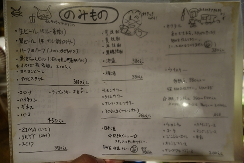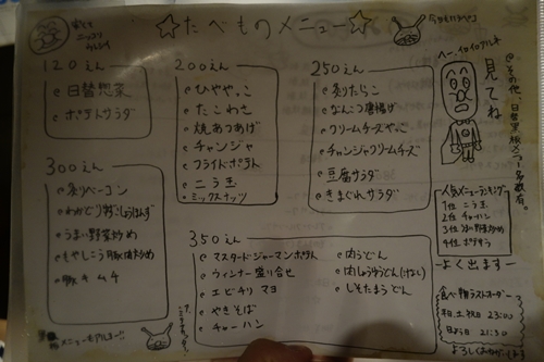 まずはいつもの生ビールをお願いしました〜!380円の生ビールいいですね〜!メニューをみてみると、、、やっぱりお料理は格安ですね〜!120円からありまして、200円とか300円とか種類が豊富にありますよ〜!しかもどれもたーちゃんが目の前で調理してくれるほぼ手作り料理なんですからこれまた頭が下がります。
