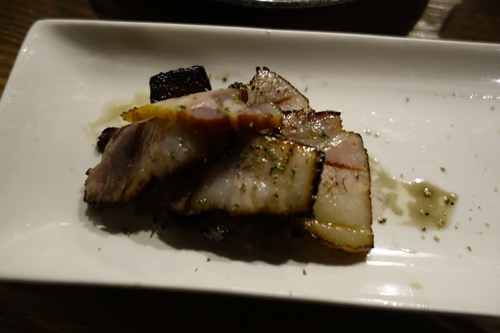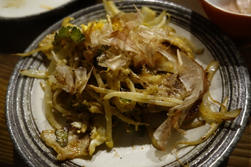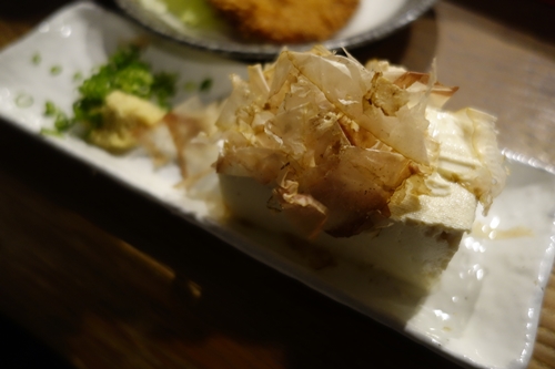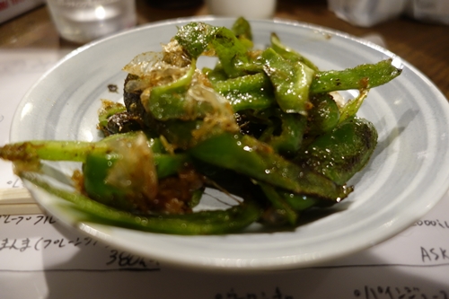 冷ややっこをいただいたあとに、かつおピーマンをいただきました!このかつおピーマン、ぜひ自宅でもやってみたくなるほどのおいしさです!ピーマンをさっといためて味付けをして、鰹節をまぶしてあるのですが風味豊かでお酒のあてに抜群なんですよ〜!すばらしい!