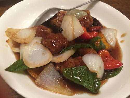 大好物の酢豚が登場しました〜!この酢豚がこれまたおいしい〜!野菜もシャキシャキ、豚肉もジュ〜シ〜!なかなかこんなにおいしい酢豚も食べれないですよ!