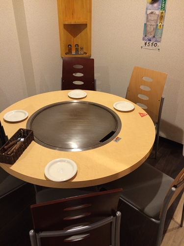 教えてもらった通り、大きな鉄板の扉がありました!インターホンを押して名前を伝えてドアを押しあけます。階段を上って2階にむかいます〜!するとお店がありました〜!今回は人数が多かったので鉄板ではなくテーブル席に!でもテーブルにももちろん鉄板がきちんとセットされていますよ〜!