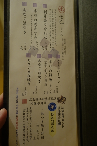 お店に到着すると江田島かきという大きなのぼりが!期待が膨らみますね〜!お店に入ると、、すごい!満席!しかもほとんどが常連さんのようですね!奥に一つだけある座敷のみ空いていました!ラッキーですね!
