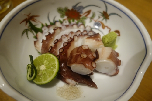 まずはタコのお刺身とウマズラハギの生チリをお願いしました〜!まずはタコからいただきます!うん、おいしい〜〜!程よい歯ごたえがいいですね!タコって私個人的にはなかなかおいしいものに出会わないのですがおいしいのに出会ってしまいました!