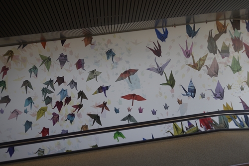 スロープを歩いて降りていくと壁面に大きな折り鶴をモチーフとした絵が!かっこいいですね〜!