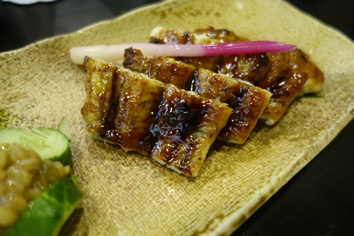 うなぎと肝をお願いしました!まずはうなぎから!大きいうなぎですね〜!いただくと、、、煮きりも上品な甘さですばらしい〜!肝もいいお味していますね〜!
