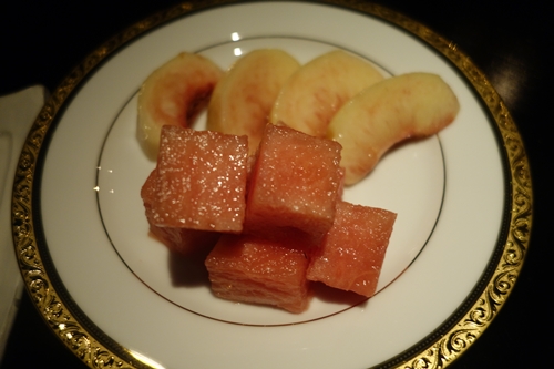 一緒にフルーツをおねがいすると、この日はなんと桃とスイカ!おいしそう〜〜〜!まずは桃からいただきました!甘い!これはおいしい桃ですね〜!スイカもいただくと、、、こちらも甘い!最高じゃないですか〜!