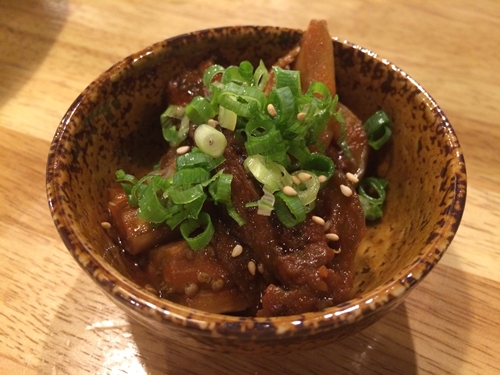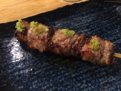 まずは生ビールをお願いして、ちょっとおなかがへっていたので串を数本お願いしました!先付はなんと茄子のキムチ!茄子ってキムチにできるの?と思ったのですがいただいてみると、、これが超がつくおいしさ!思わず作り方を教えてほしいっていっちゃったほどです!無農薬のいい茄子が手に入ったので作られたんだそうです。そういう感じすきですよね〜!
