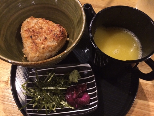 んで、登場した焼きおにぎりが、、、おっと!スープがついている、、