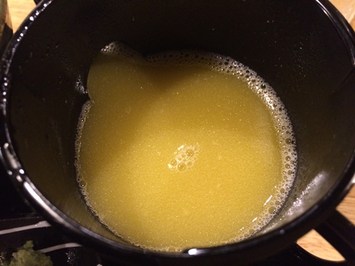 鶏オンリーでとったスープ、、、、黄金色にかがやいているじゃないですか!いい香り!まずはスープだけをいただいてみると、、うわ〜〜〜!コクがすばらしい〜!つづいて焼きおにぎりにかけていただくと、、、がーーーん!やられました、、、何の気なしに頼んだのに、、とてつもない感動が!