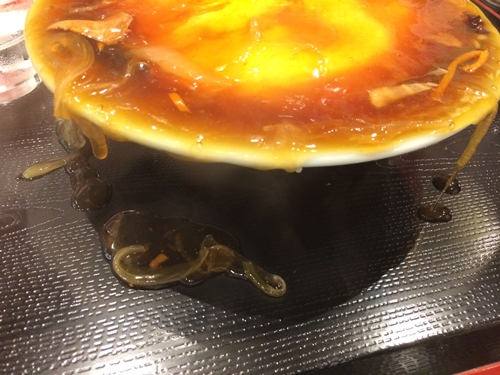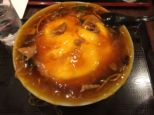 そこへ登場しました〜!蓬莱さんの天津丼!おいしそう〜!熱々ですから、やけどに注意ですよ〜!そして、、もう一つの特徴が、、、、必ず餡がこぼれています。昔はもっとこぼれていて器をもったらべとってついていました。笑。これが蓬莱さんの特長なんですよね〜!たっぷりにかけてくださるのでうれしいですよね〜!