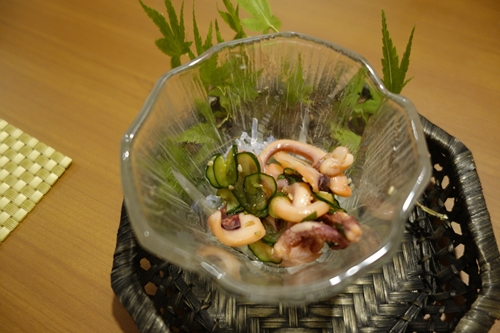 奥のテーブル席に案内していただきました!まずは生ビールで乾杯して、先付のイカの酢の物をいただきます。おいしい〜!なかなかやりますよ〜!